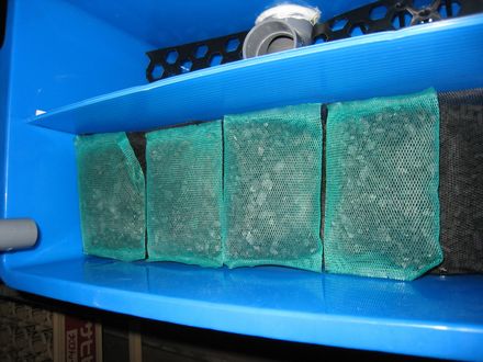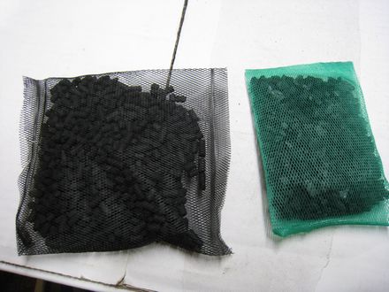 まずは、水の水質の悪化を防ぐ活性炭を自作濾過層にセットして水を越冬用プラ舟に貯めます。でその活性炭を新しい物を用意したのですが・・・安いと思って去年と違う商品を買ってみたら小さくて失敗^^;