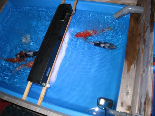 地下の車庫にプラ船ジャンボ400を2個並べて錦鯉の越冬池にしてみました。